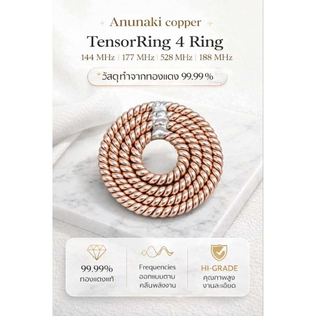 Tensor Ring คือวงแหวนที่ทำจากลวดทองแดงบริสุทธิ์ ถักและพันอย่างพิถีพิถัน ตามสูตรความยาวที่คำนวณจากหน่วย คิวบิต (Cubit) โบราณ